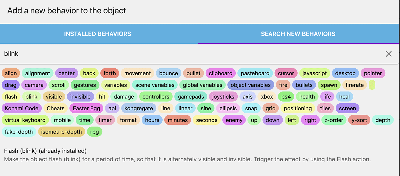 First, the "Blink" behavior already exists. It's available as an extension you can search and install for your project. Let's add it to our enemies. First, we find it:
