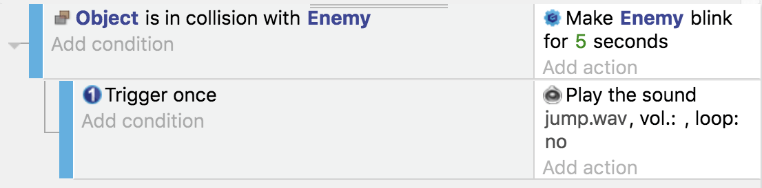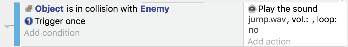 Not bad for a single event in the scene events sheet! And we could add more objects and make the behavior more complex. Or we can reuse it for another object that should behave the same as player. We can even disable this behavior if we want the player not to play a sound when colliding with enemies.